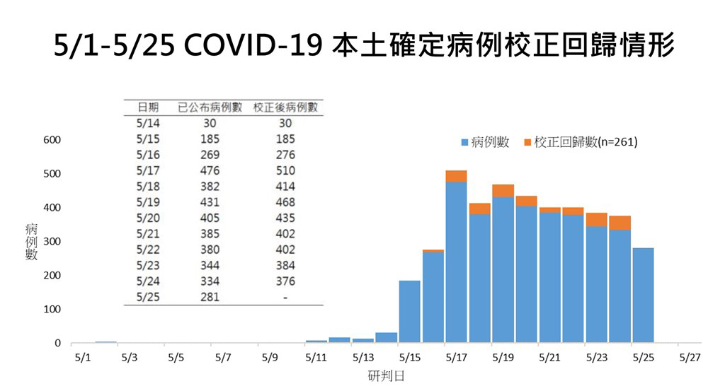 台灣防疫指揮中心宣布,台灣今日(25日)再增542例本土確診病例,包括281例本土病例、261例「校正回歸」個案;新增2例境外輸入病例;新增6例死亡病例。