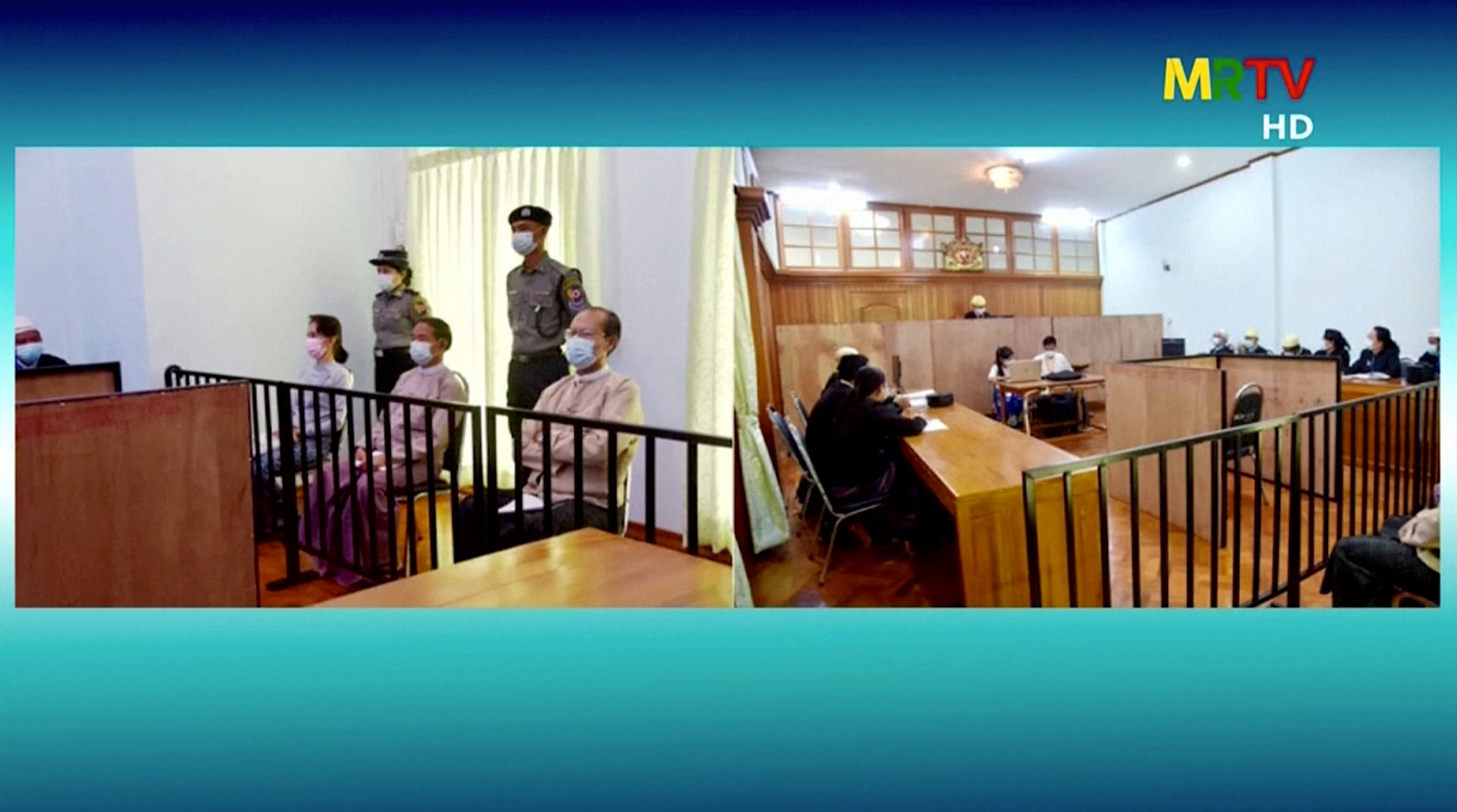緬甸軍方今年2月推翻昂山素姬(Aung San Suu Kyi)領導的政府後,昂山素姬周一(5月24日)首次在公開場合現身,親自到法庭應訊。緬甸國家電視台(MRTV)公布的畫面中,昂山素姬身著藍色長裙,佩戴口罩,與另外兩名前任領導人一起現身法庭。他們的身後則是兩名警察。