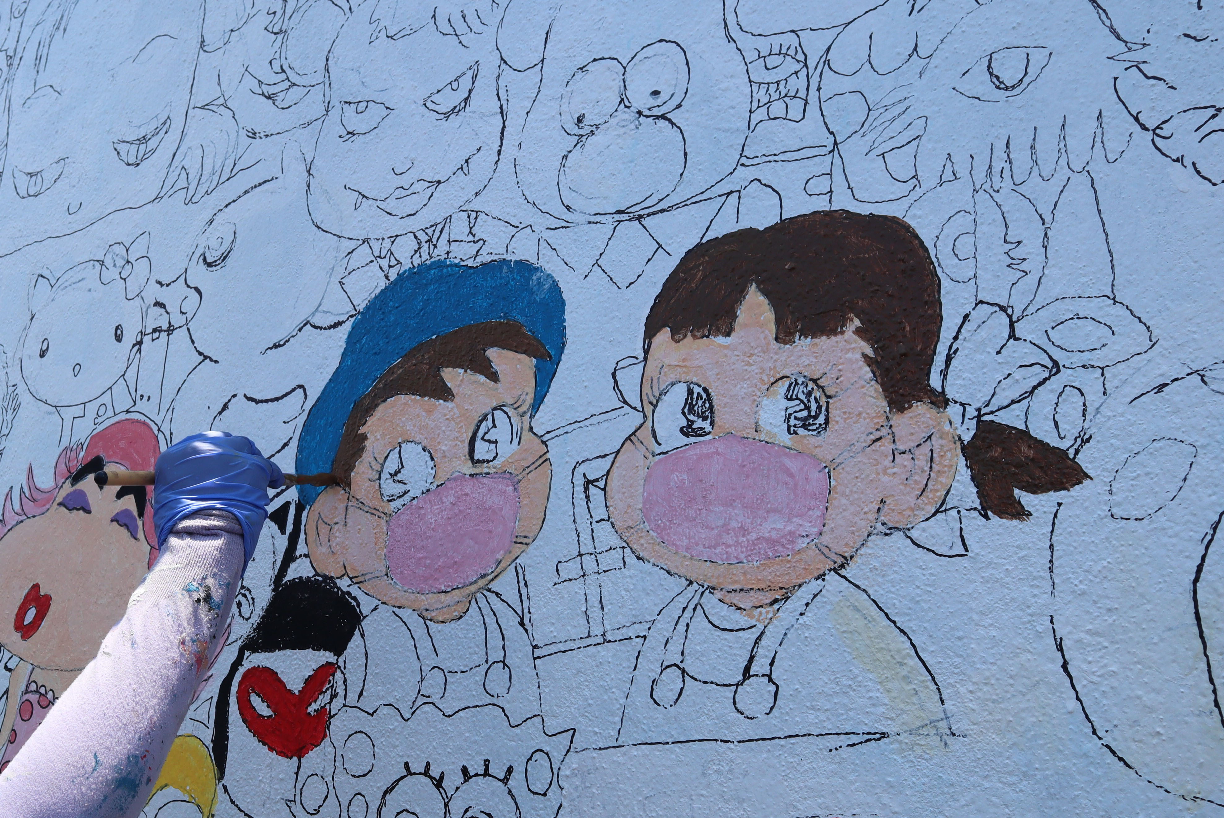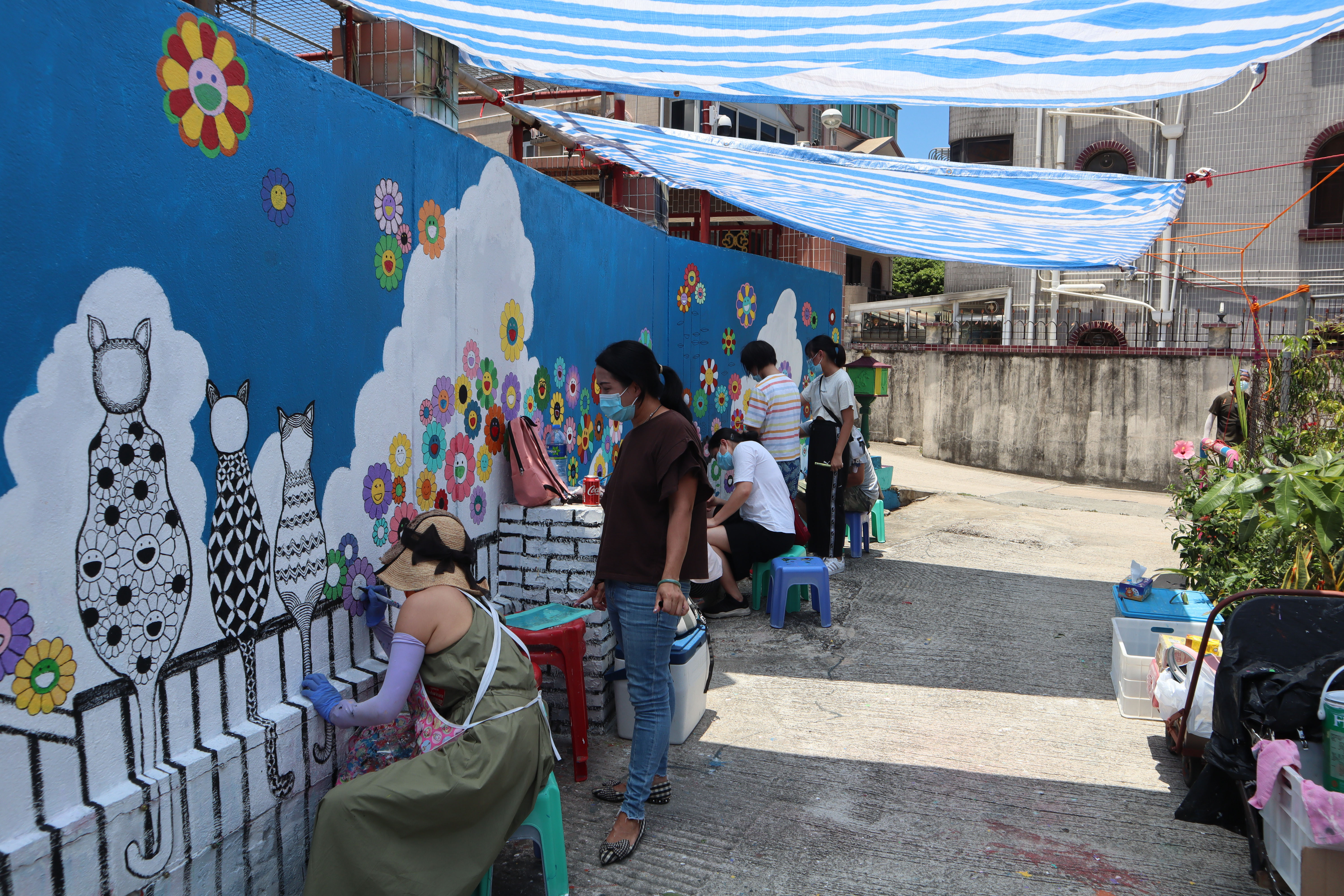 藍地屯門新村內一幅長約百呎的圍牆,由染滿污穢不堪的漆油,慢慢變成充滿現代藝術風的壁畫,如草間彌生的圓點花紋圖案、村上隆的微笑太陽花、簡潔抽象的禪繞圖案,此外 ,還有充滿童趣的動漫卡通角色 。壁畫的繪者為兩名藝術家Linda(王麗娜) 及Jojo(何艳女裳), 周日亦會有義工及學生幫忙。近來天氣炎熱,儘管有酷熱天氣警告,她們仍努力一筆一筆地畫,期望盡快在暑假來臨前完工,因為香港人現在都很不快樂,盼他們看後心裏可舒暢些,重現笑容。