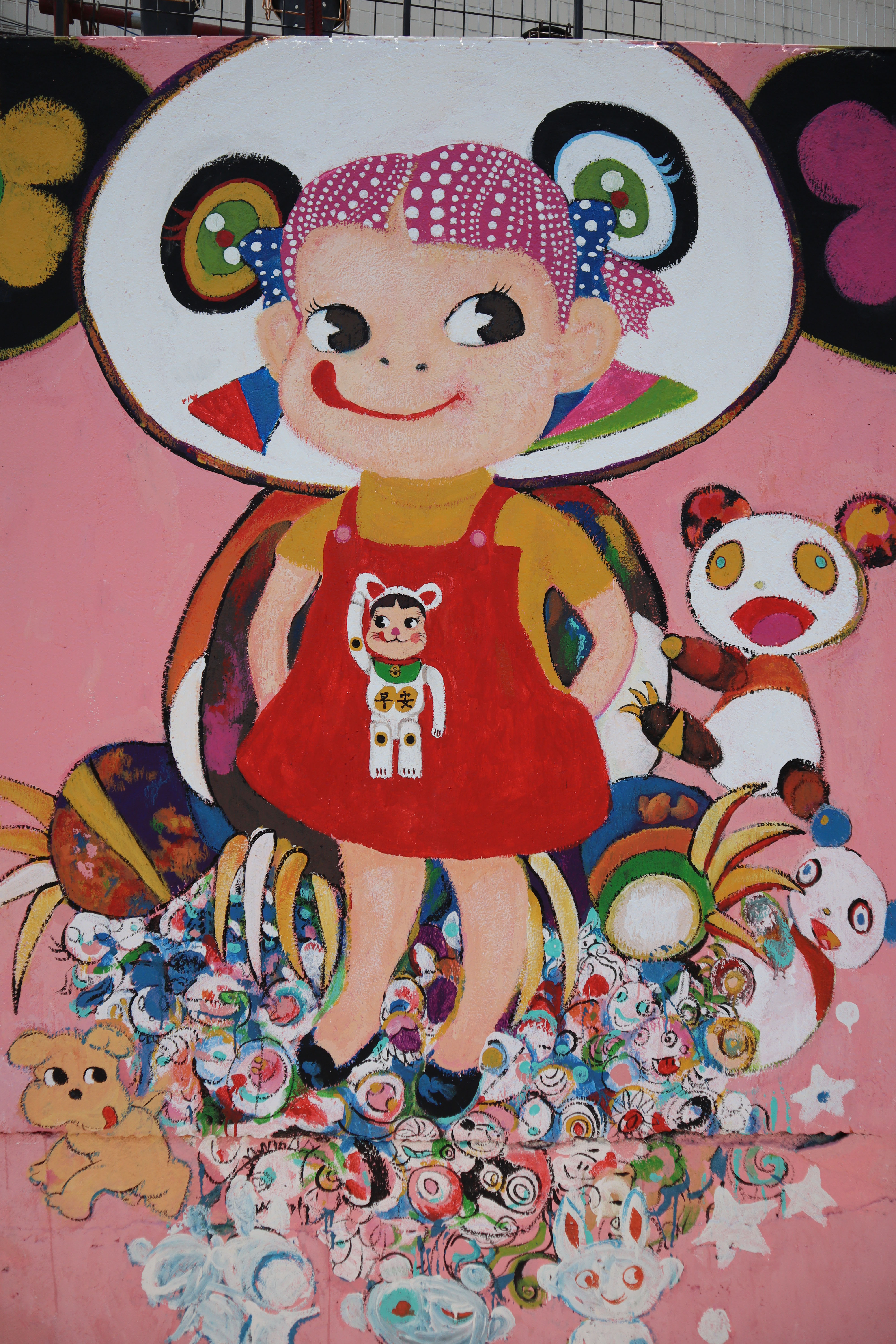 Jojo則採用了日本草間彌生的圓點花紋圖案創作,草間的圓點花紋,色彩鮮明,她用之與世界聯繫,其中南瓜作品尤為人喜愛。Jojo創作的圓點花紋壁畫圖案中 ,最引人注目的是日本糕餅店宣傳人物「牛奶妹」,它的草間風味十足,與禪繞奔馳馬一樣,同是一見難忘!Jojo說,她酷愛動漫卡通,覺得它們予人無憂無慮感覺,收藏品亦有很多,曾擁有二百多個牛奶妹 ,這次在圍牆的壁畫創作中,她亦首次繪畫大量卡通人物。