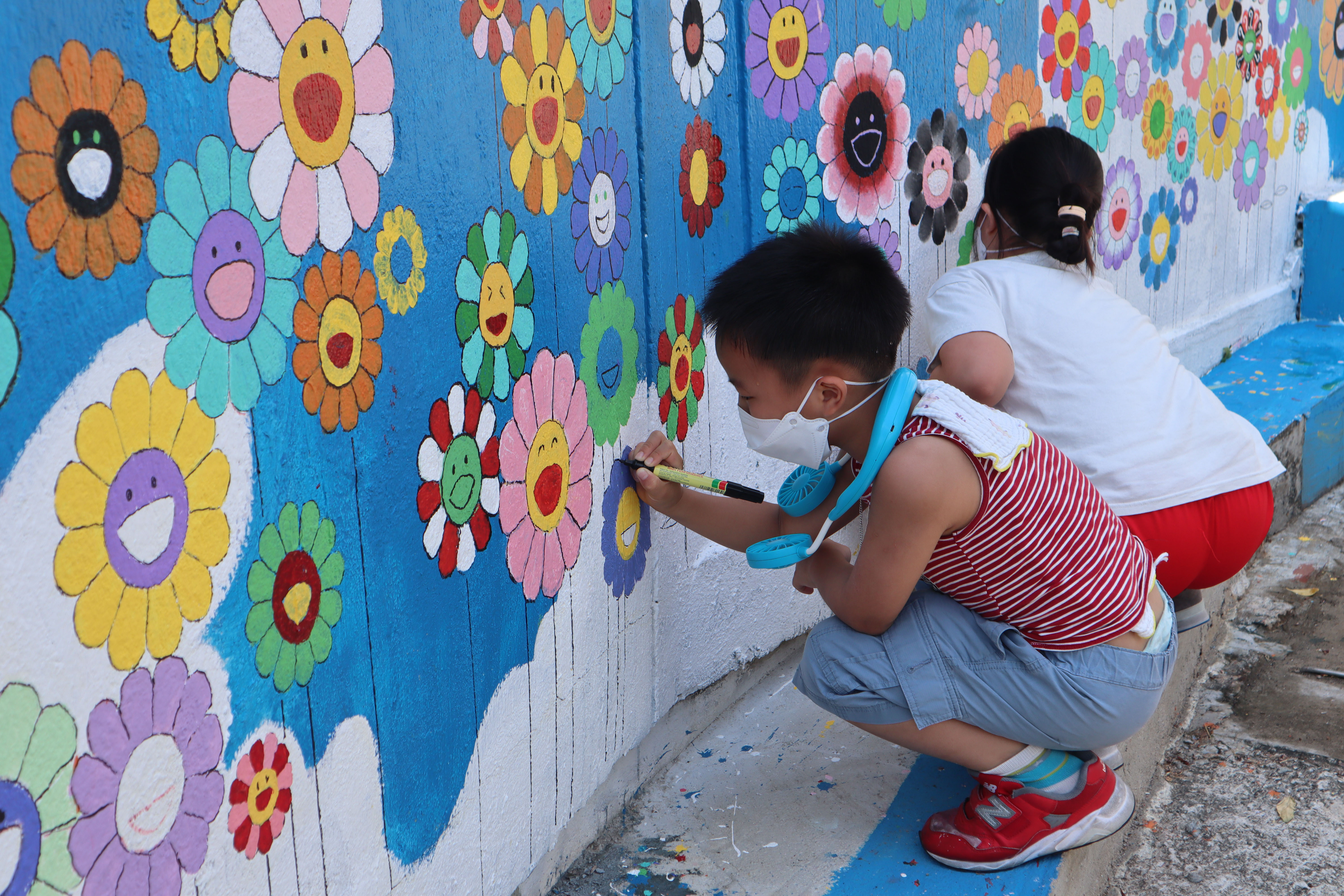 Linda用上了日本村上隆的微笑太陽花,以及美國的禪繞風格創作貓、馬等動物。村上隆的美學是色彩繽紛 、可愛及簡單,微笑太陽花是最貼切的展現。由於義工及學生們的藝術造詣尚淺,太陽花適合他們繪畫,有些將太陽花繪成打呵欠模樣,有些戴了眼鏡,可愛度爆燈。來自美國的禪繞畫被譽為心靈藝術,有助紓緩壓力、釋放身心,是帶有治療功效的公共藝術。