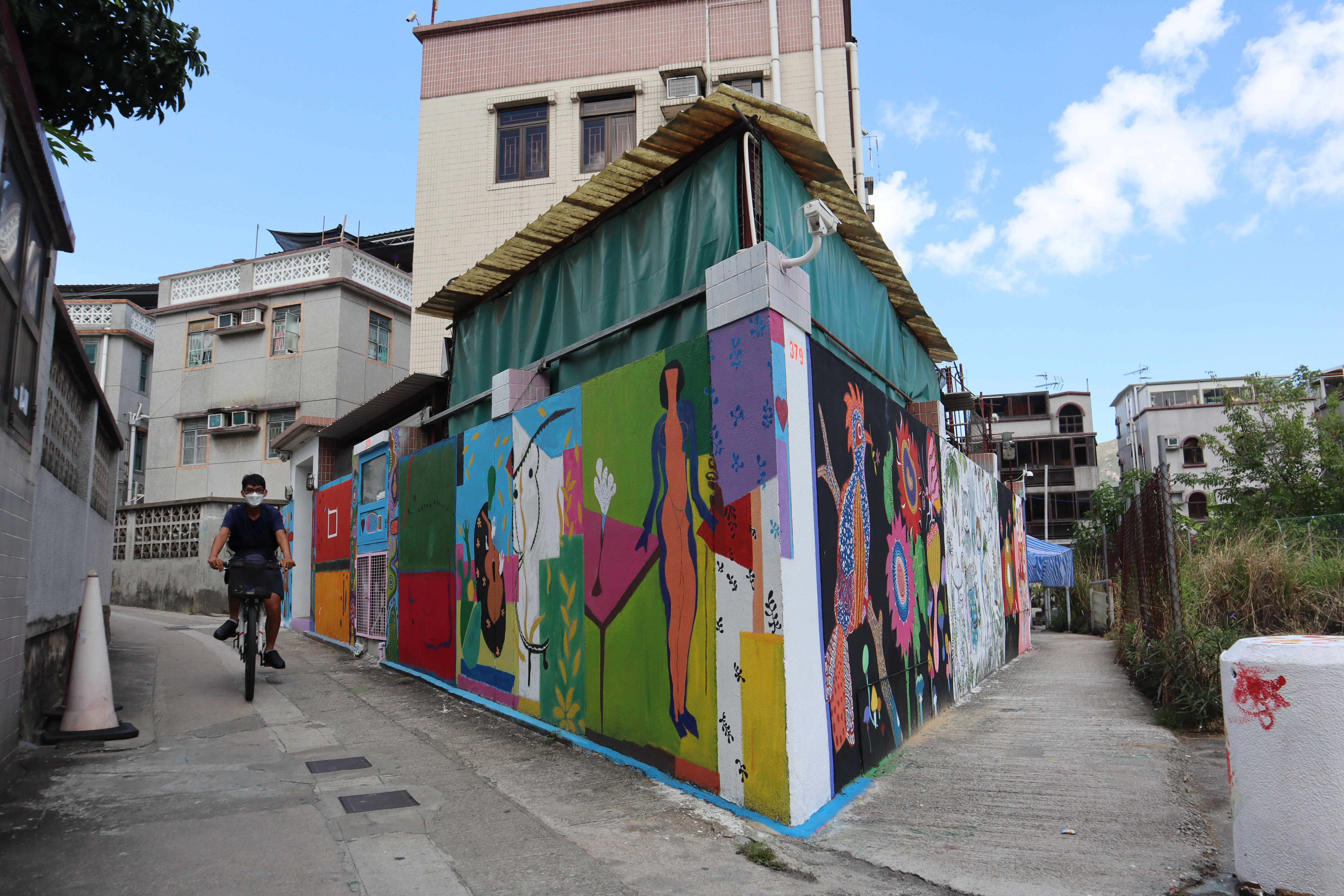 5月16日中午,天文台已發出酷熱天氣警告,屯門氣溫高達攝氏33度,手繪壁畫地點位處藍地屯門新村,從村口沿無瓦遮頭的村路走,已感熱浪襲人,幸好只走幾分鐘便到達。更幸運的是,現場已撐起可遮擋太陽的藍白帆布。圍牆呈三角形狀圍著村屋,這屋主人是屯門新村村長陶兆林,遮陽帆布是他及附近村落居民一同搭起。陶村長除出力外,亦有出錢,所有顏料均由他提供,形容只是一點心意,最可貴是藝術家們肯捱義氣。