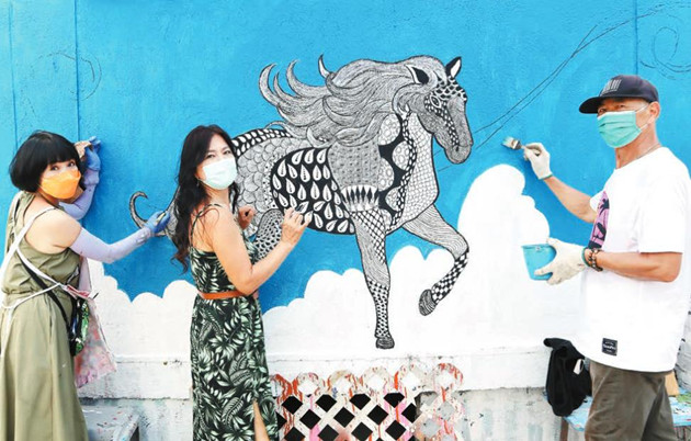 左起: Jojo 、Linda 及陶兆林希望壁畫帶給人開心感覺。這幅禪繞奔馳馬是Linda作品。記者 鄭玉君攝