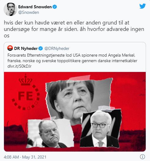 丹麥廣播公司(DR)的報告爆出後,斯諾登在推特上發表了一條神秘的丹麥語評論:「如果多年前有某種理由進行調查就好了。哦,為什麼沒有人警告我們?」 (網絡圖片)