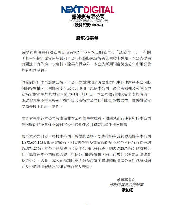 壹傳媒指出,於5月26日的公告,有關保安局局長向黎智英發出通知,公告就有關事宜提供進一步資料。公司指出收到該信函及通知後,就該通知是否禁止黎智英行使所持公司股份的投票權,已向國家安全處尋求澄清,以使公司可遵守該通知及信函中就指定財產施加規定。於5月31日公司收到國安處信函,確認黎智英不得直接或間接行使其所持有的公司投票權,惟獲得保安局局長授予許可除外。