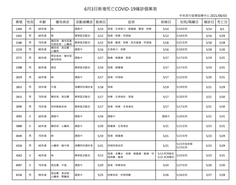 今日新增的17例死亡個案,共計為男性13位、女性4位,年齡介於40多歲至90多歲,發病日介於5月12日至5月25日,確診日介於5月14日至5月27日,死亡日期介於5月28日至6月1日。其中一例死亡病例為40多歲女性,本身無慢性病,但有華區活動史,個案於5月13日發病 有發燒、流鼻水、咳嗽、喉嚨痛、胸痛、呼吸困難、腹瀉等症狀,5月13日進行採檢PCR陰性,之後在5月21日PCR篩檢為陽性,並於5月25日住院,5月23日確診,5月31日死亡。