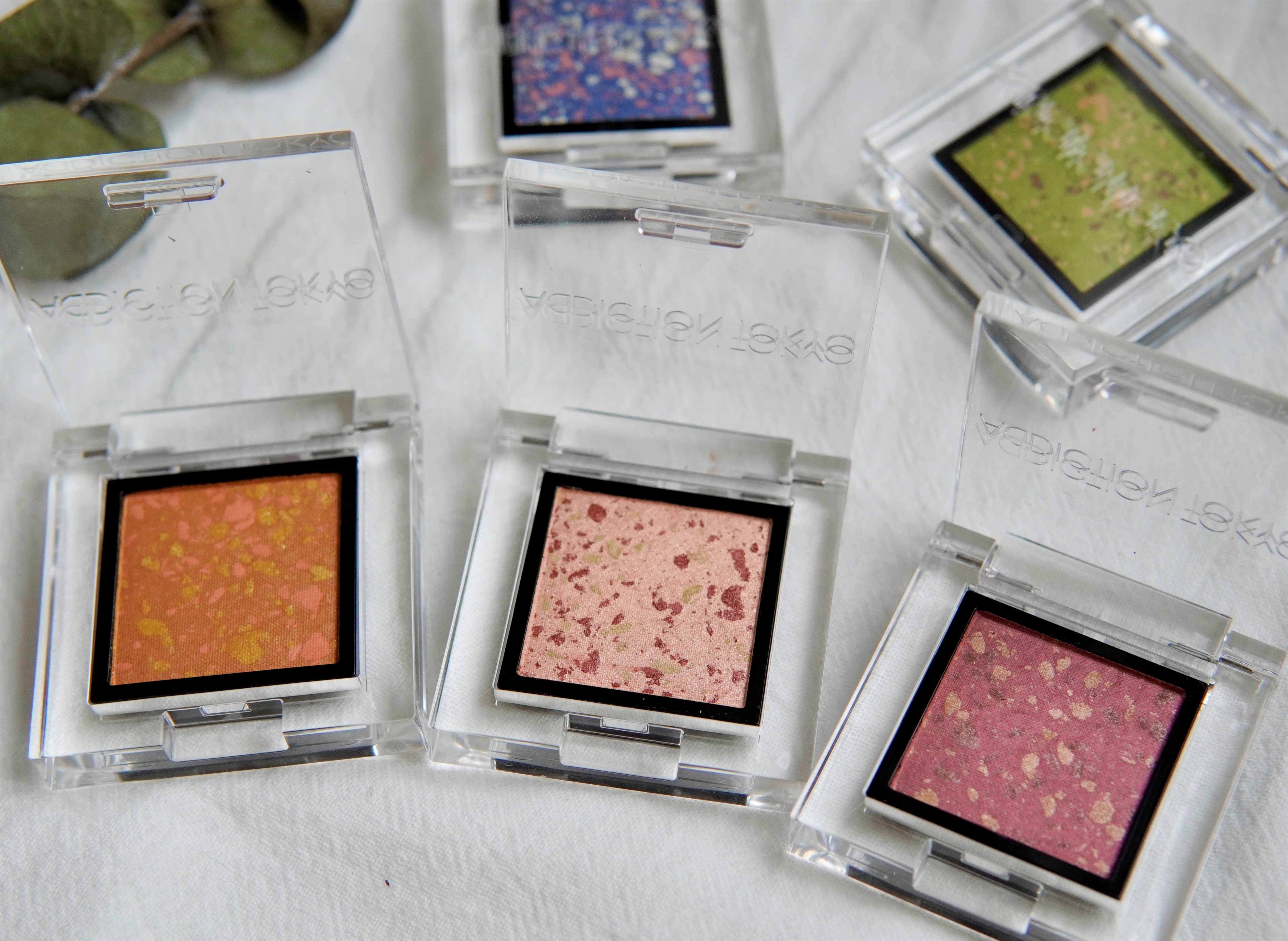 睛藝水晶原石眼影的101柔和橄欖綠色、102蜂密黃玉啡色、103瑪瑙淡珊瑚色、104紅寶石色及105藍托帕石色(從左至右)。眼影帶有微微珠光,顏色清透自然,新手也不用擔心重手。