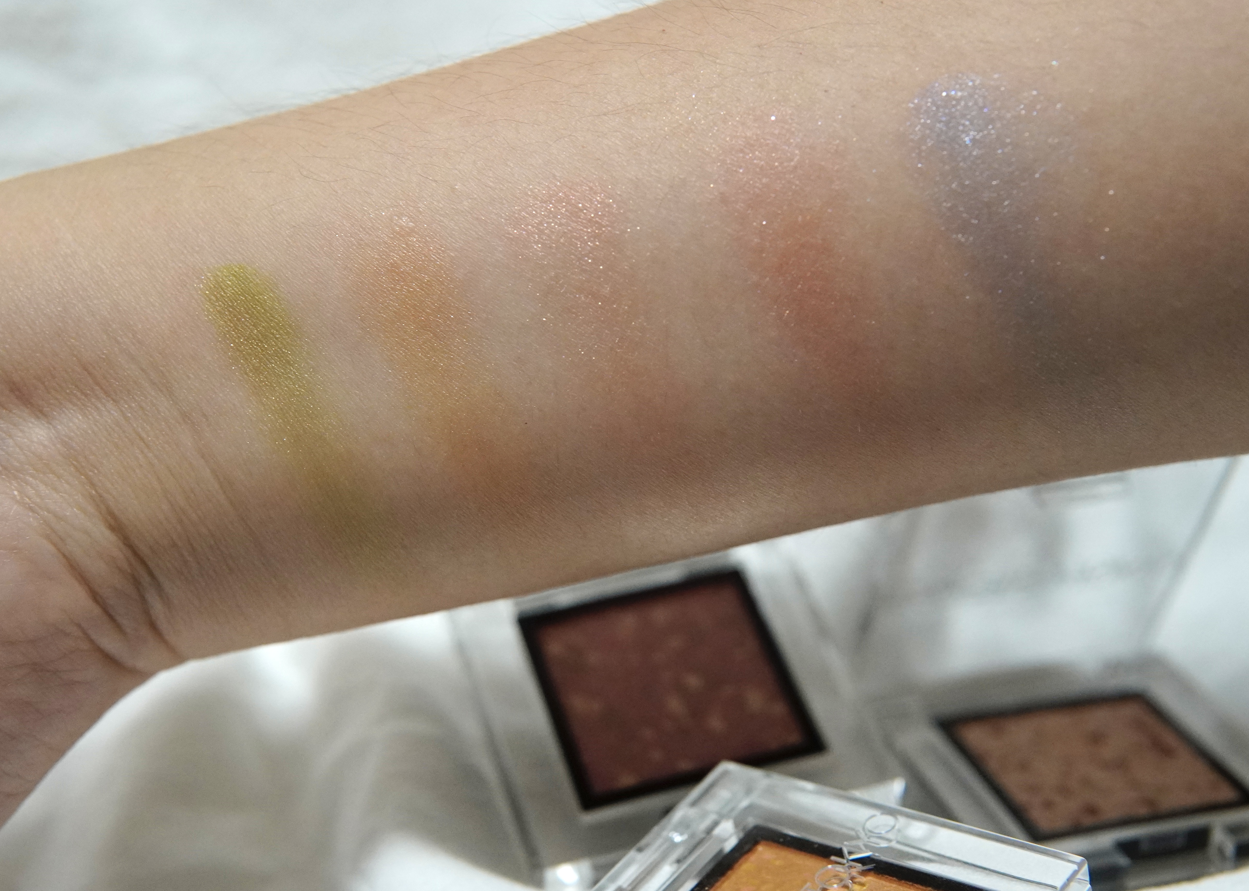 睛藝奶油眼影102C柔和橄欖綠色、103C翡翠深綠色、104C蜂密黃玉啡色、105C瑪瑙淡珊瑚色、106C紅寶石色及107C藍托帕石色(從左至右)。眼影著色細緻順滑,色彩活潑,適合夏日。