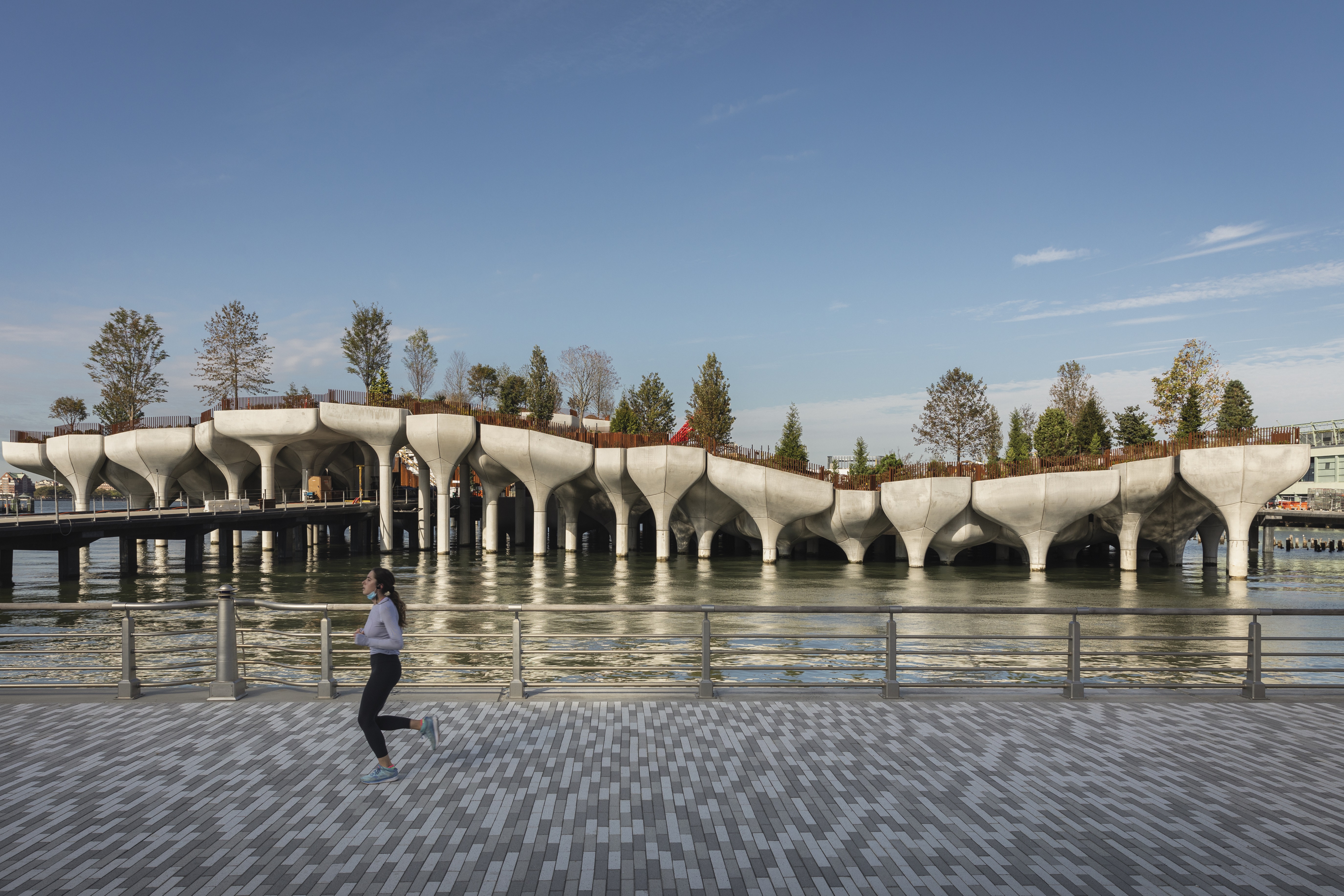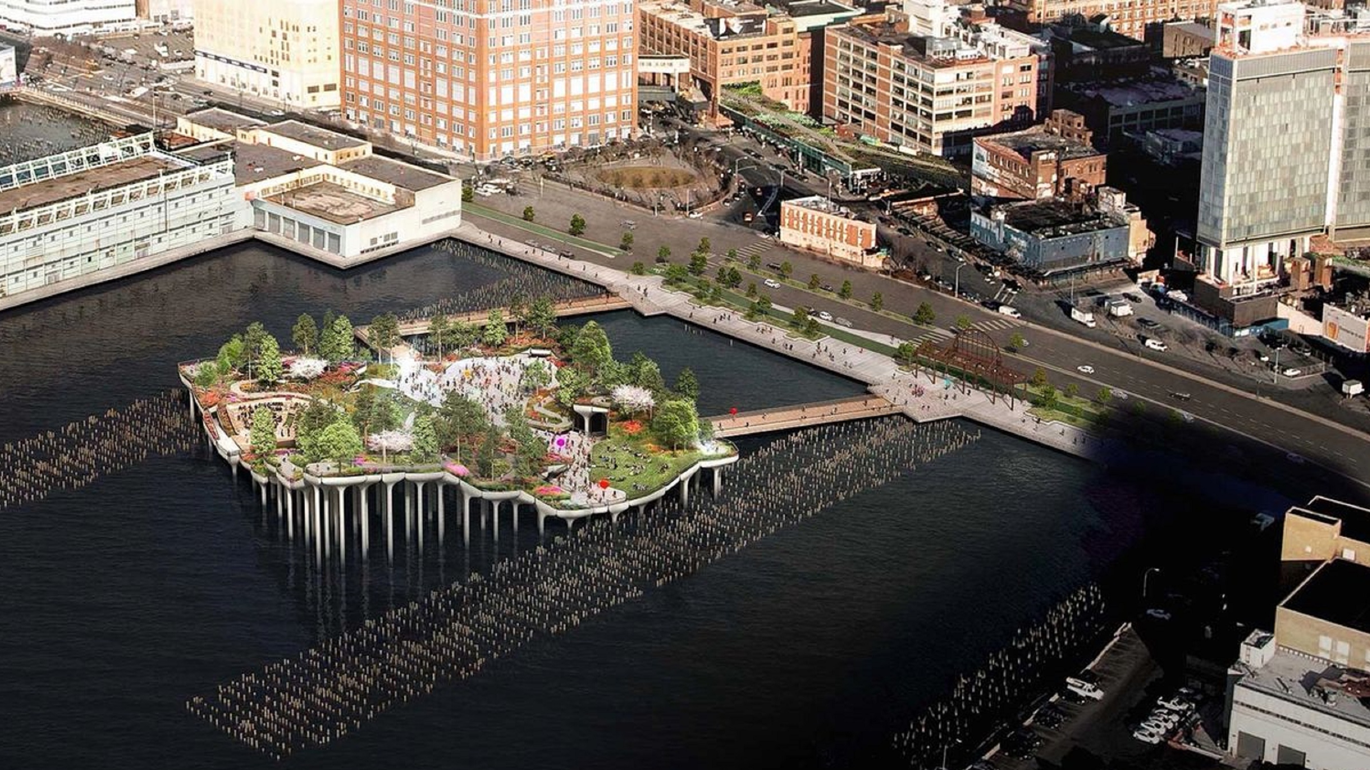 Little Island位於哈德遜河第13街,曾因過高的造價和連串的環境保護問題,而被擱置數月,最終結算的造價為2.6億美元。Little Island有132座如鬱金香花座的水泥盆柱,高低起伏、大小不一的盆柱,在水上營造出「漂浮小島」的感覺。