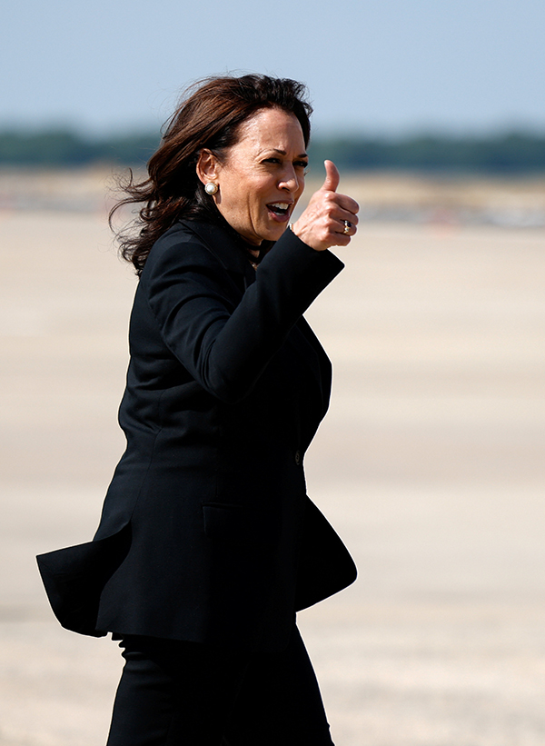 賀錦麗專機故障返回安德魯斯聯合基地後,下機時豎起大拇指。路透社