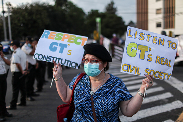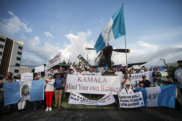 部分危地馬拉民眾上街遊行,抗議賀錦麗的到訪。橫幅上寫有「回家吧賀錦麗」及「賀錦麗別多管閒事」等字樣。路透社