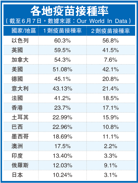 至於香港,特區政府疫苗接種計劃高效、免費且疫苗廣泛可用,惟接種疫苗人口比例仍一直偏低,疫苗開始接種1個月後接種率僅佔本港總人口的6%左右。所幸,疫苗接種計劃進入第四個月之際,接種率開始有了起色。