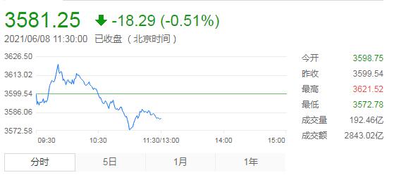 截止午間收盤,滬指跌0.51%,報3581.25點,深成指跌0.81%,報14742.68點,創業板指跌0.39%,報3215.65點。滬深兩市成交額6235.4億元;北向資金實際淨流出3.87億元。兩市79股漲停,14股跌停(含ST)。