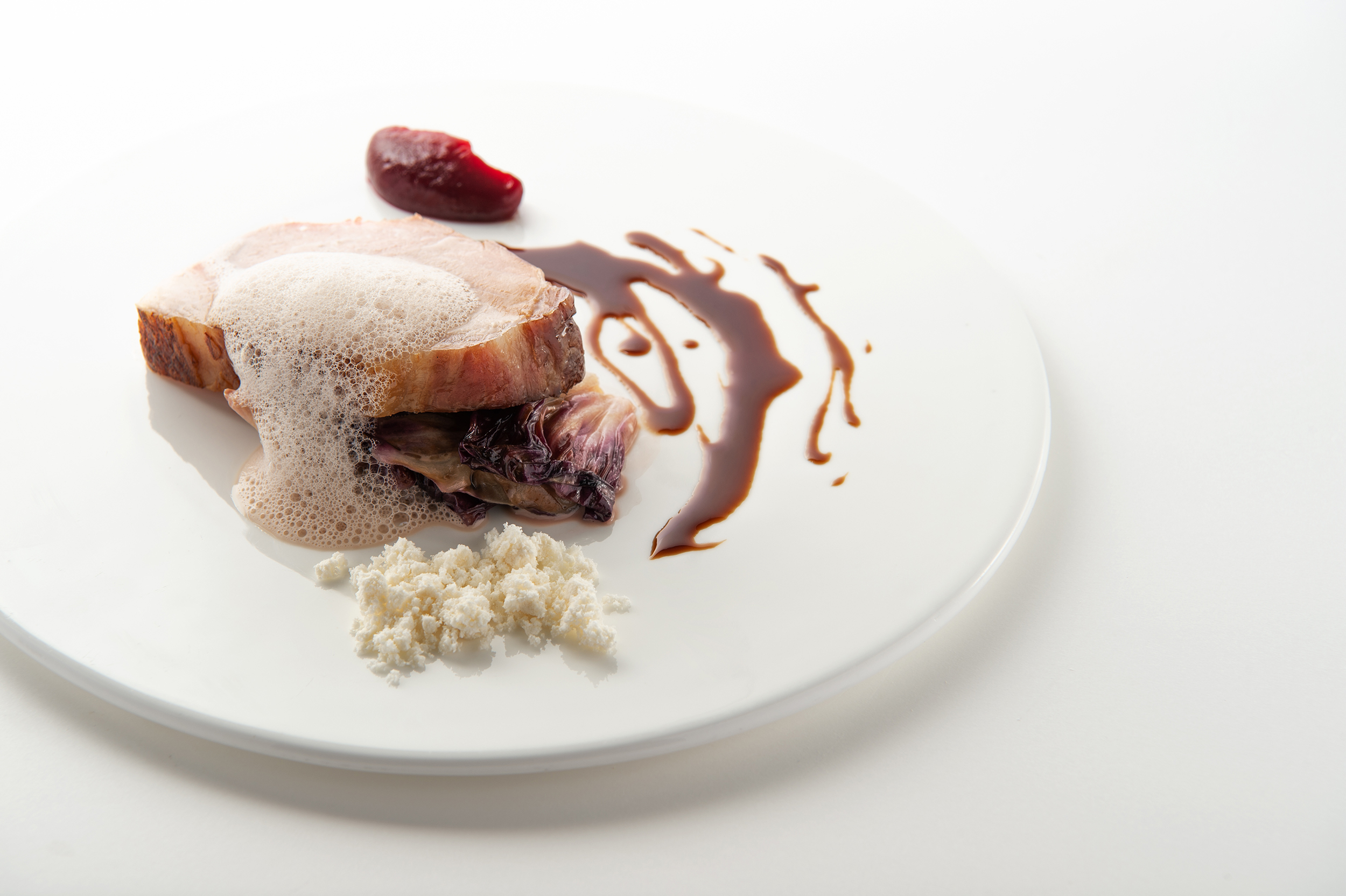 紅菜頭蓉、紫菊苣、特製紅酒汁與純天然高山飼養的大和豚,各帶來甜、苦、酸、鹹的味道。