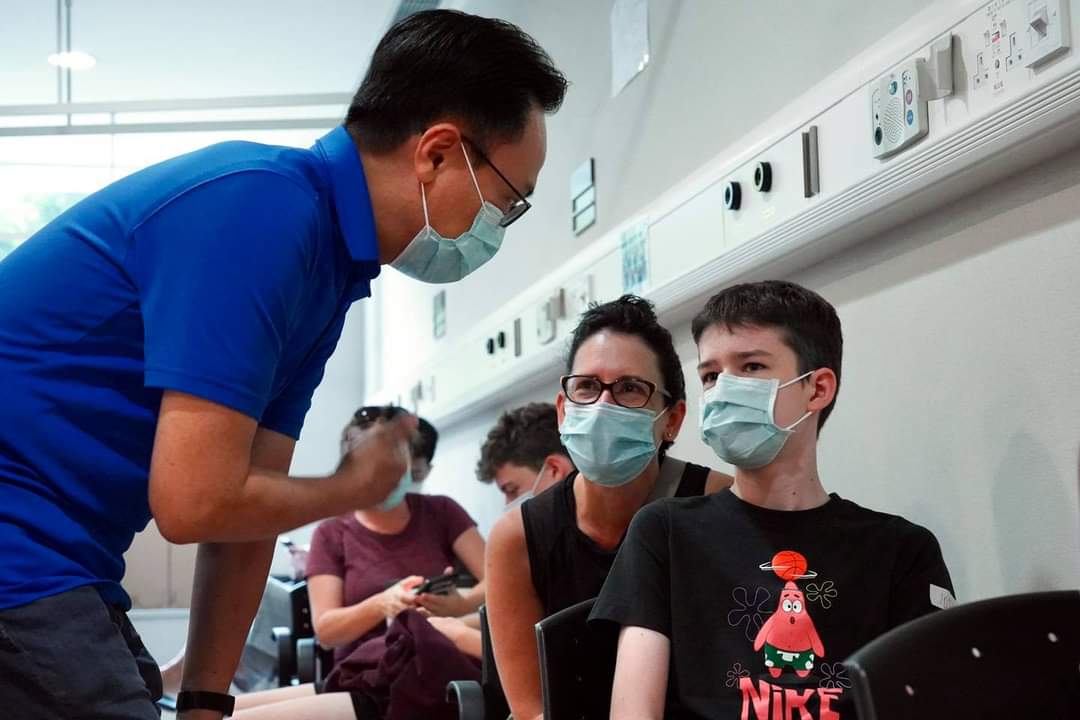 接種中心不乏外籍人士,14歲的Bennett在媽媽陪同下來到中心,媽媽早已接種兩劑疫苗,她從新聞得悉接種年齡放寬感到興奮,隨即為兒子預約。Bennett接種後感覺良好,更不感疼痛。