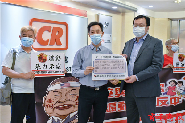 「蘋果假新聞及毒新聞監察組」多名成員今日(15日)到金鐘道政府合署高座公司註冊處遞交請願信,強烈要求公司註冊處維護國家安全及公共秩序,盡快剔除壹傳媒公司註冊,以保障大眾利益。稍後,監察組再到西九龍裁判法院外請願,要求法庭嚴懲黎智英的罪行,以維護本港法紀。