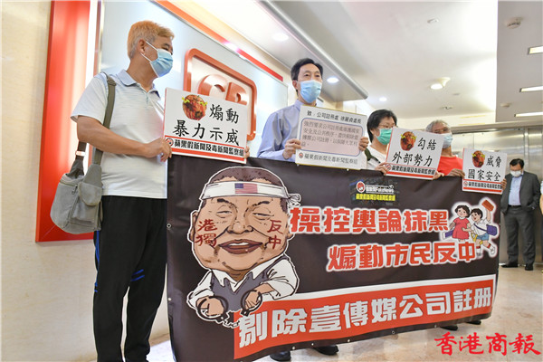 請願人士在場拉起抗議橫額,又高呼口號,包括「肥佬黎為美國而戰 壹傳媒損港利益」、「毒蘋果抹黑香港警察 壹傳媒煽動暴力示威」、「肥佬黎勾結外部勢力 毒蘋果威脅國家安全」、「肥佬黎反中亂港多年 剔除壹傳媒公司註冊」。