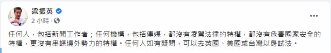 警方國安處今晨(17日)拘捕《蘋果日報》5名董事及高層,指他們涉嫌串謀勾結境外勢力危害國家安全罪。全國政協副主席梁振英今日在社交平台Facebook上連發數條帖文指出,任何人,包括新聞工作者;任何機構,包括傳媒,都沒有淩駕法律的特權,都沒有危害國家安全的特權,更沒有串謀境外勢力的特權。他指出,任何人如有疑問,可以去英國、美國或台灣以身試法。
