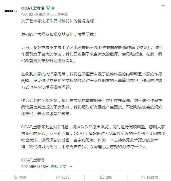 今日,原定要展出其該作品的OCAT上海館在官微道歉,稱近日藝術館在展覽中展出了藝術家宋拓於2013年拍攝的影像作品《校花》,該件作品引發了較大的爭議。OCAT上海館決定從即日起,將該件作品撤出展覽,同時進行閉館調整。