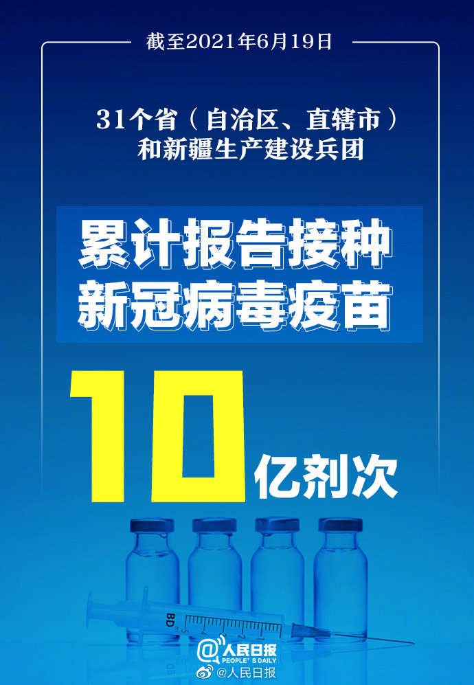 截至2021年6月19日,31個省(自治區、直轄市)和新疆生產建設兵團累計報告接種新冠病毒疫苗101048.9萬劑次。