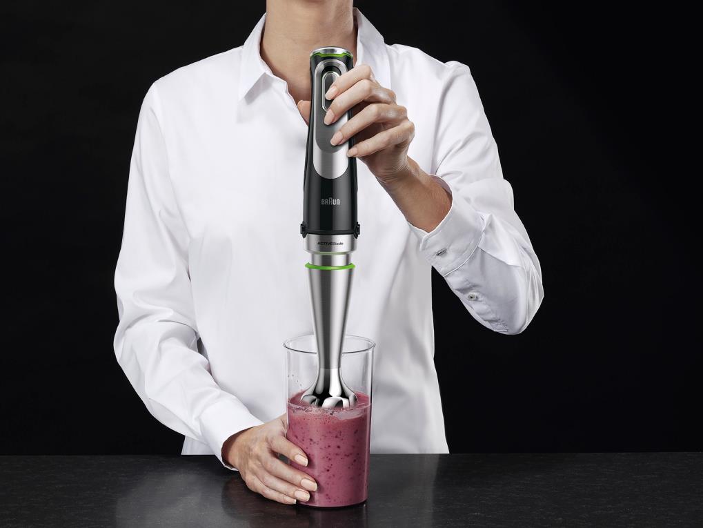Braun MultiQuick 9手提攪拌棒 (售價HK$1298),採用ActiveBlade技術,金屬軸刀鋒可上下移動,專為輾碎堅硬食材而設計,能增加250%的切割面,與品牌其他非ActiveBlade手提式攪拌機相比,可省力省時40%。