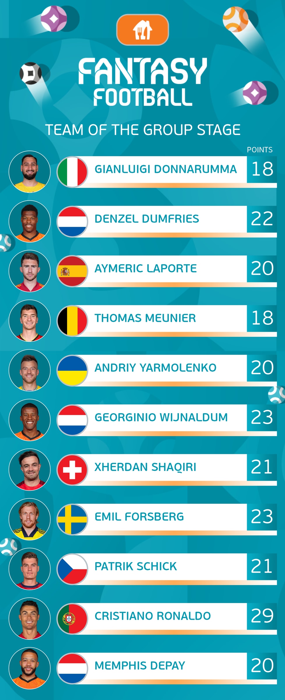 歐洲盃小組賽最佳陣容: