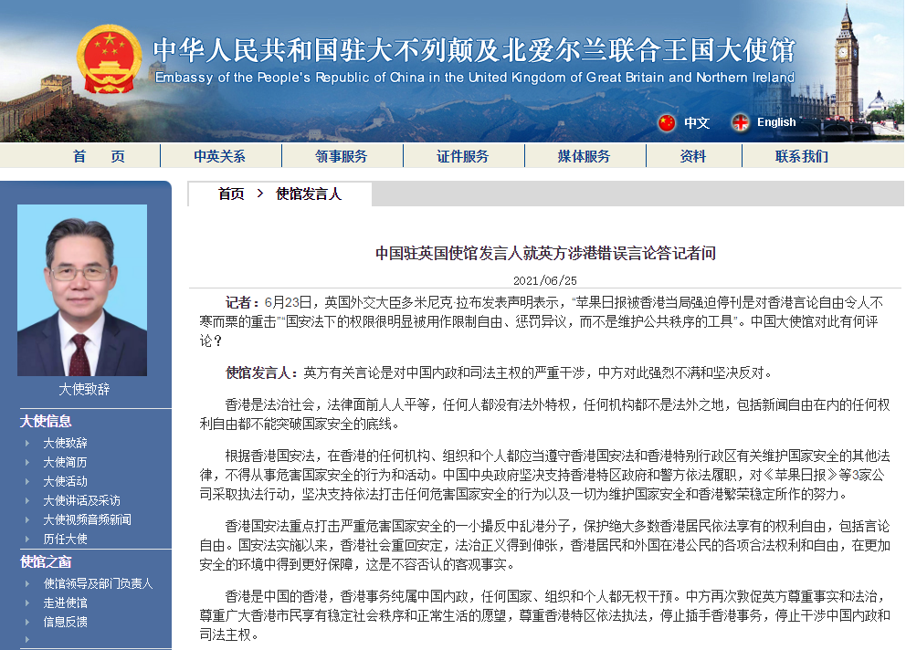 記者:6月23日,英國外交大臣多米尼克∙拉布發表聲明表示,「蘋果日報被香港當局強迫停刊是對香港言論自由令人不寒而慄的重擊」「國安法下的權限很明顯被用作限制自由、懲罰異議,而不是維護公共秩序的工具」。中國大使館對此有何評論?