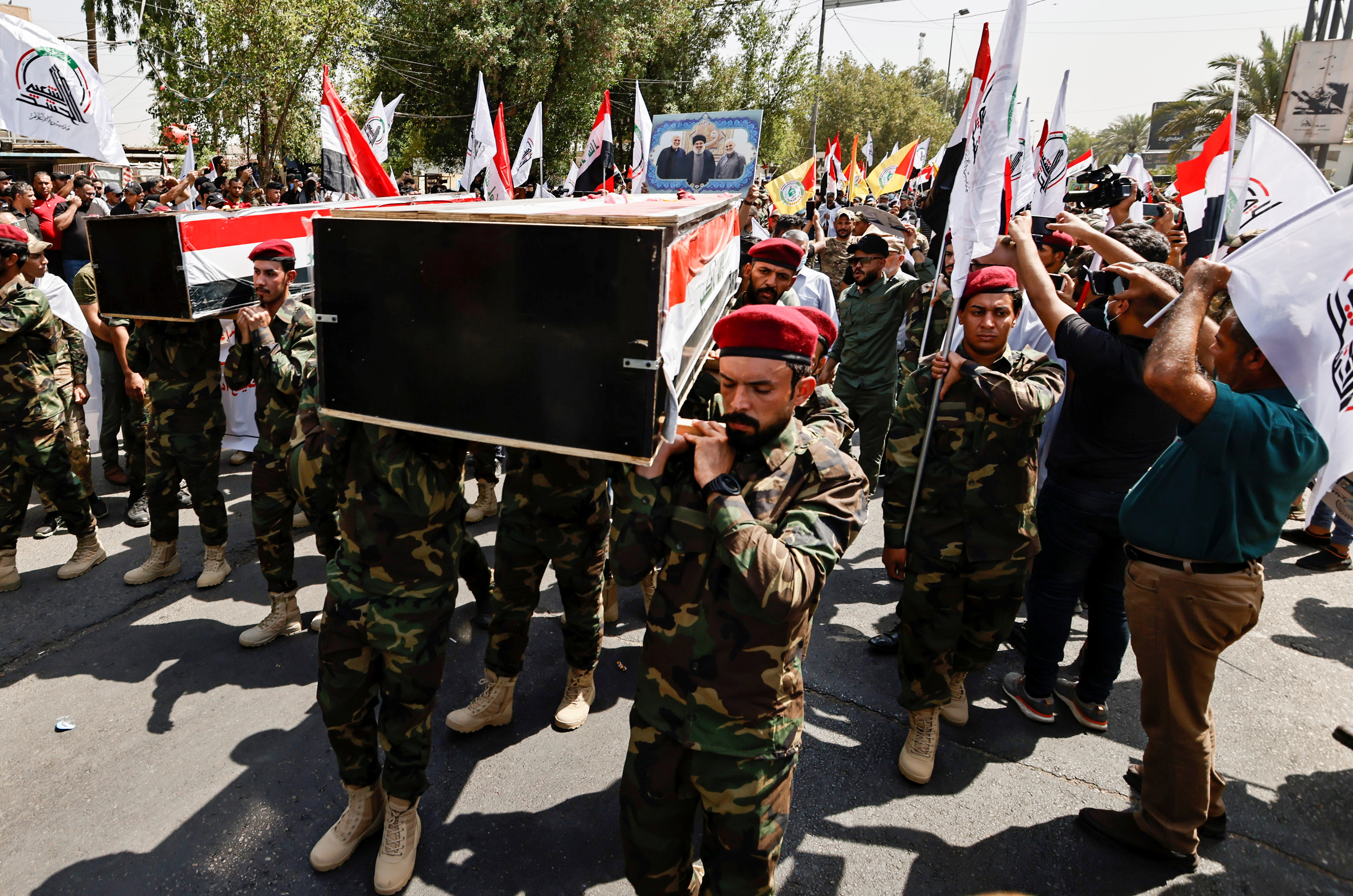 6月29日,在伊拉克巴格达举行的象徵性葬礼上,伊拉克人民动员部队(PMF)成员抬着在美伊边境空袭中丧生的PMF成员的模拟棺材。路透社