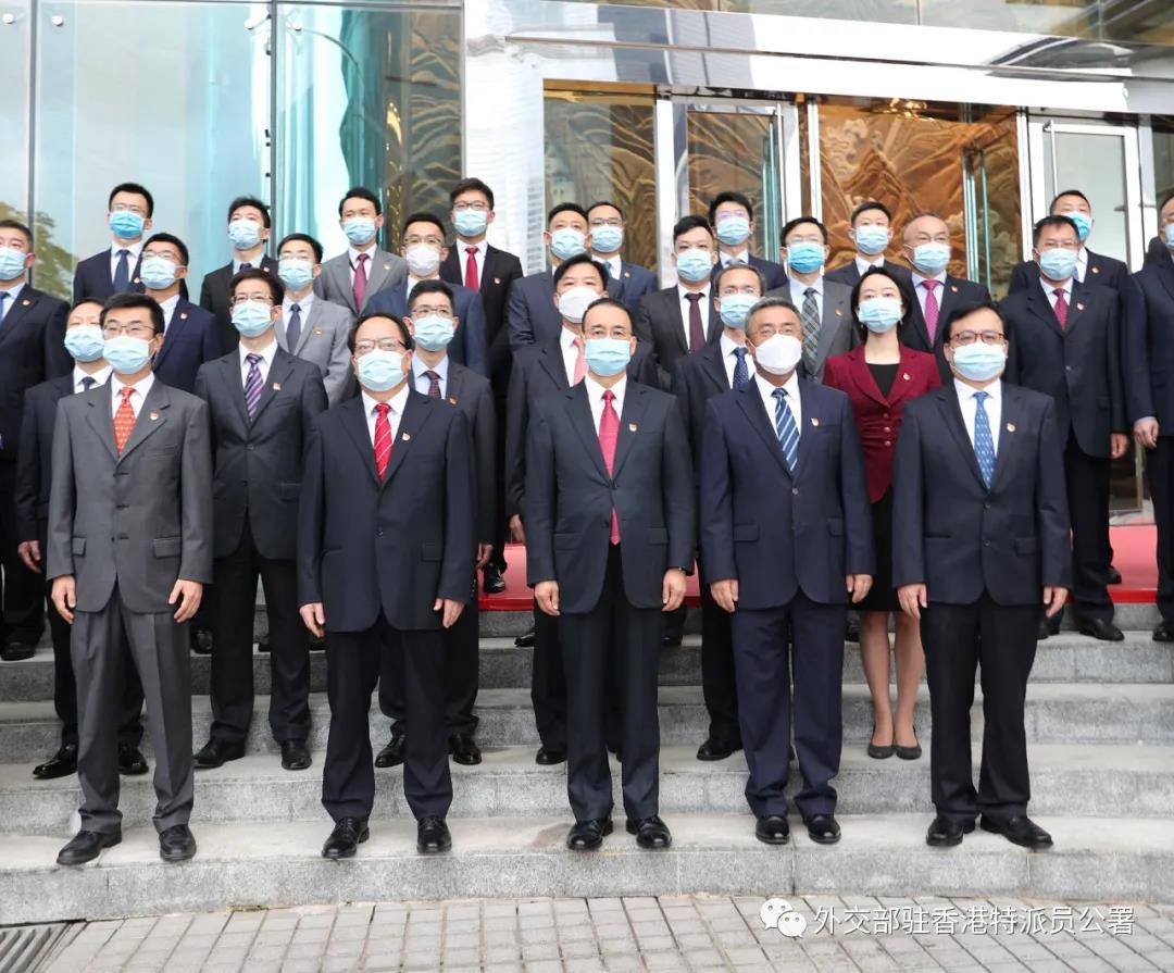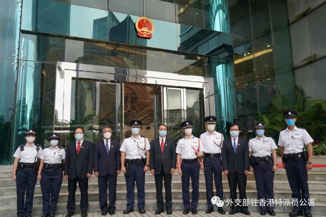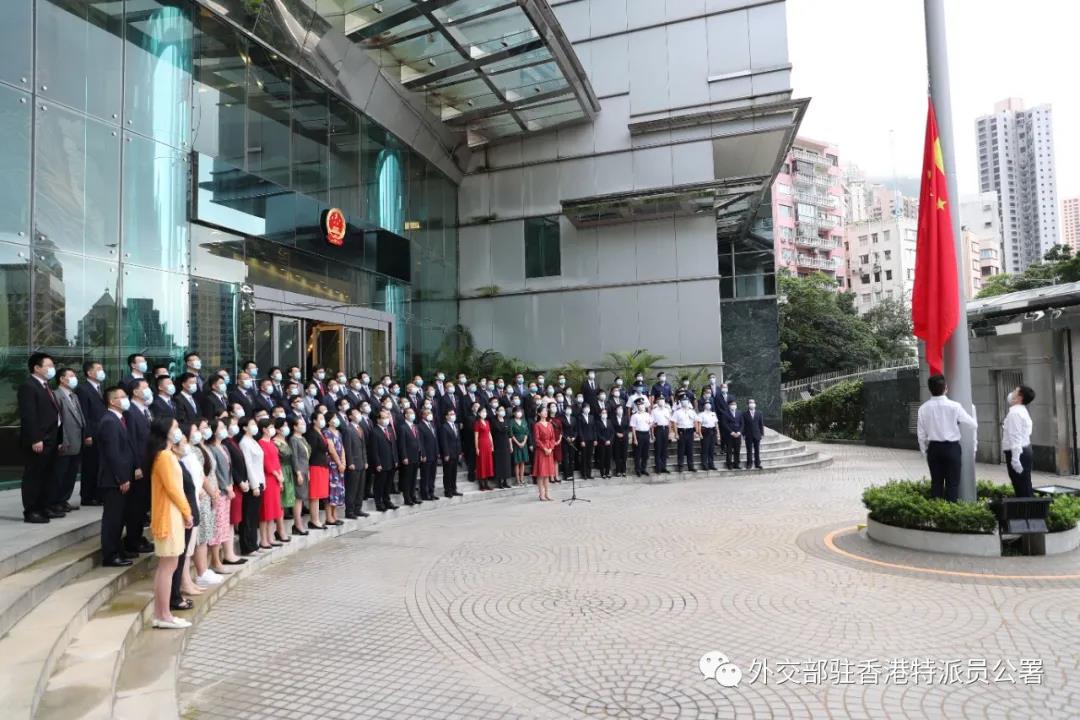 為熱烈慶祝中國共產黨百年華誕和香港回歸祖國24周年,外交部駐港公署隆重舉行「七一」升旗儀式。劉光源特派員帶領全體署領導、署員、隨任隨居家屬和特區警隊、港基物業代表等共110多人參加。