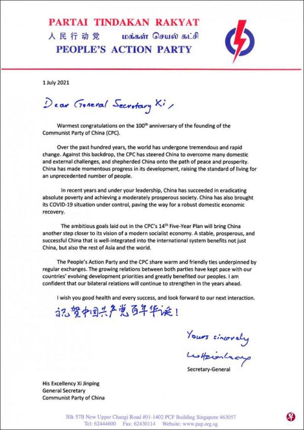 李顯龍是以新加坡人民行動黨秘書長身份發出賀函給習近平。他在信中指出,在過去100年世界經歷巨大而迅速改變的背景下,中國共產黨帶領中國克服了諸多國內外的挑戰,並引導中國走上和平與繁榮的道路。在中國共產黨領導下,中國的發展突飛猛進,讓無數中國人民的生活水準得以提升。