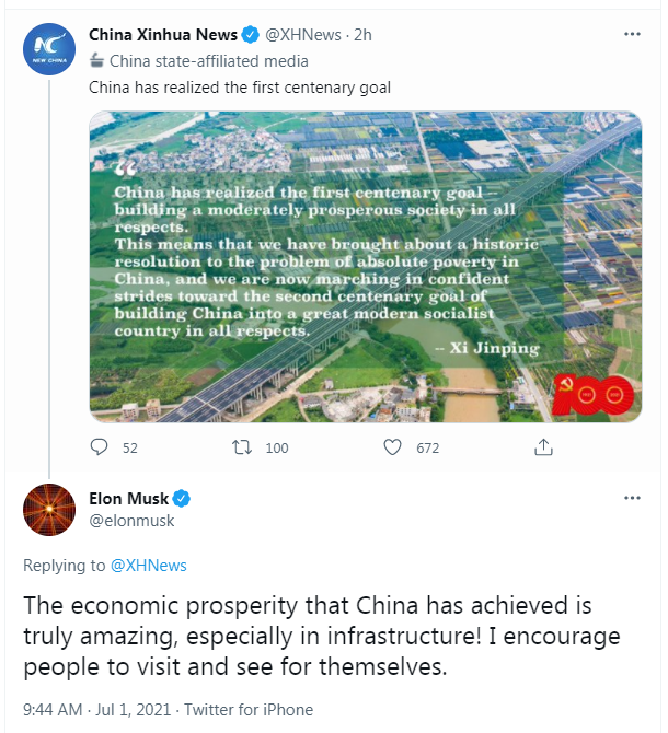 據環球網報道,在周四慶祝中國共產黨成立100周年大會上,中國莊嚴宣告實現了第一個百年奮鬥目標,在中華大地上全面建成了小康社會。隨後,特斯拉CEO馬斯克在推特稱,中國取得的經濟繁榮確實令人讚歎。