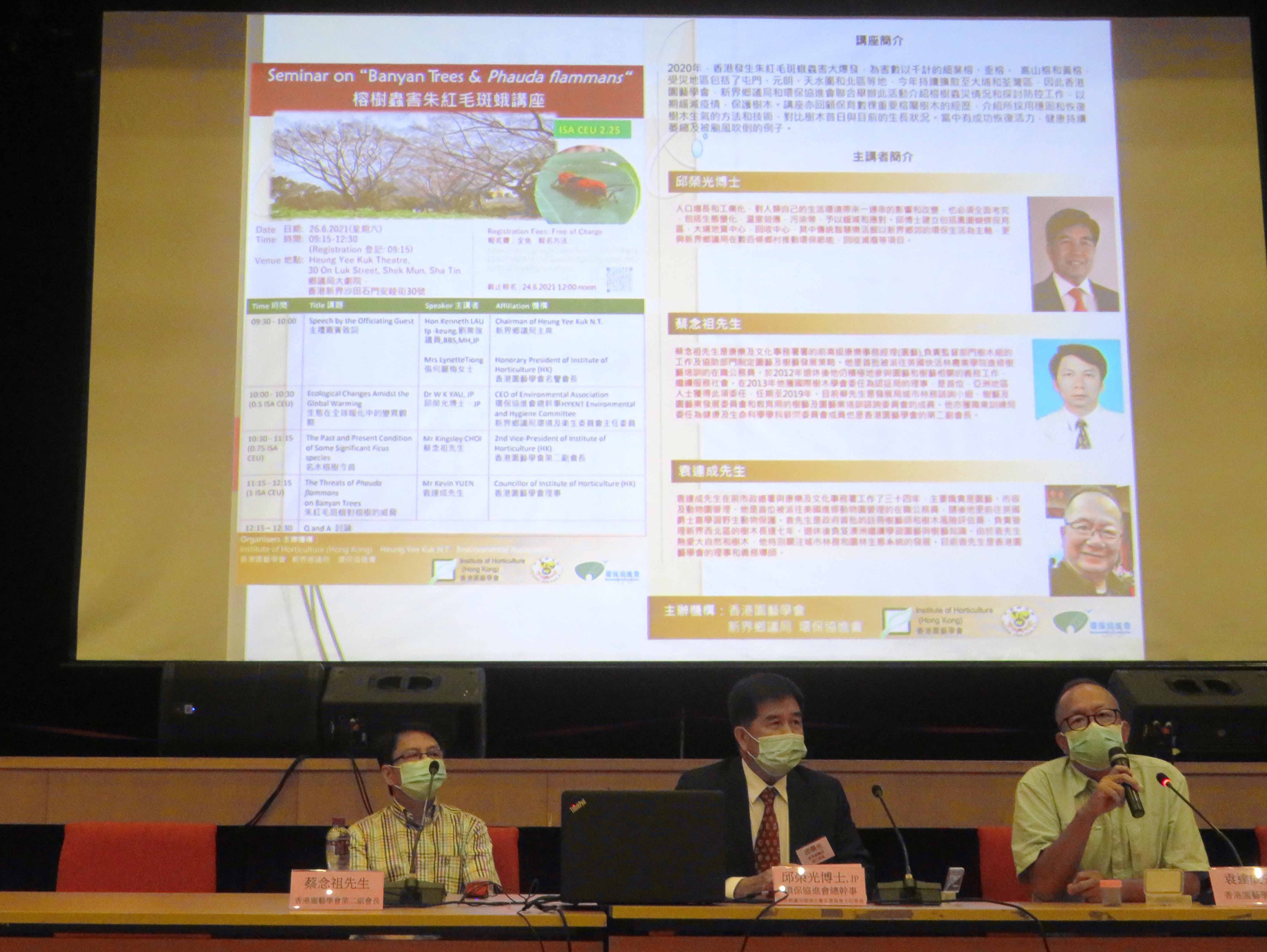 6月26日香港園藝學會、新界鄉議局和環保協進會舉辦「榕樹蟲害朱紅毛斑蛾」講座,香港園藝學會名譽會長張何麗梅指榕樹生長見證鄉村變化,希望通過講座集思廣益,探討解決蟲害問題方案。