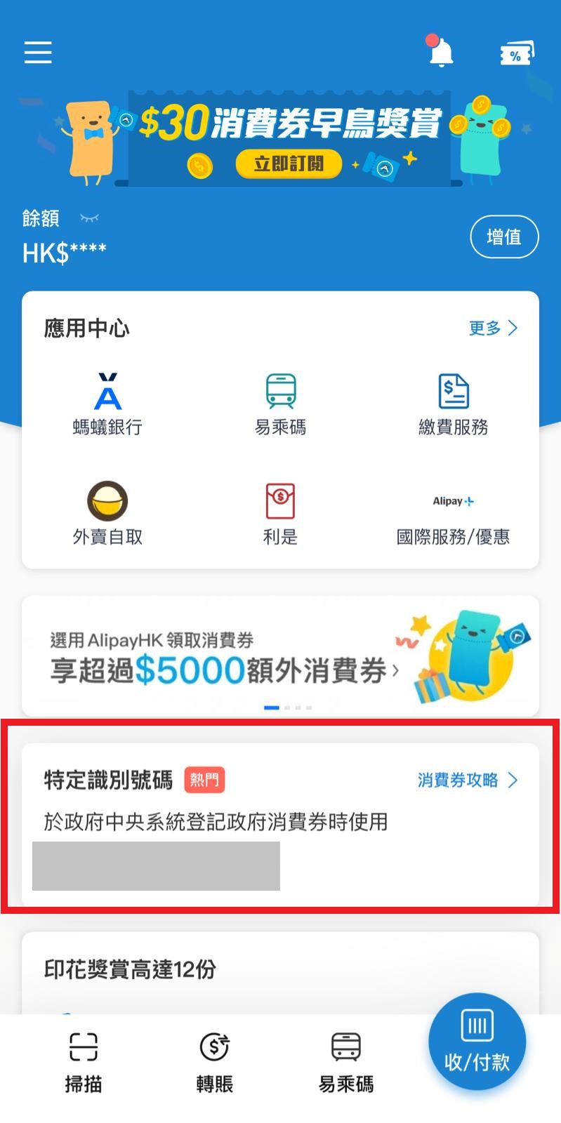 AlipayHK指要賺取以上優惠,市民先要在政府中央系統填寫基本資料並選擇AlipayHK領取電子消費券,最後輸入AlipayHK首頁上「特定識別號碼」,即能完成登記;,AlipayHK賬戶待政府核實身份流程後就會於指定日期內收到政府發放的電子消費券,並可享受AlipayHK系列優惠。
