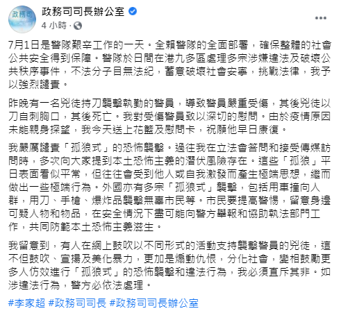 今晚(2日),政務司司長李家超在社交媒體帖文,嚴厲譴責昨晚發生的「孤狼式」恐怖襲擊事件。並直斥鼓吹、宣揚及美化暴力,煽動仇恨、分化社會,變相鼓勵更多人仿效進行「孤狼式」恐怖襲擊和違法的行為。強調如涉違法行為,警方必依法處理。全文如下: