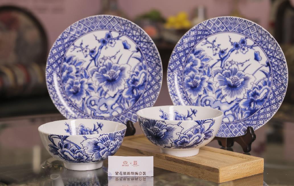 供指定換領的青花瓷具,包括仙山瓊閣青花對碗(一套共兩件6吋瓷碗)(上)、繁花似錦盤碗套裝(一套兩件6吋瓷碗及兩件9吋瓷碟)(下)