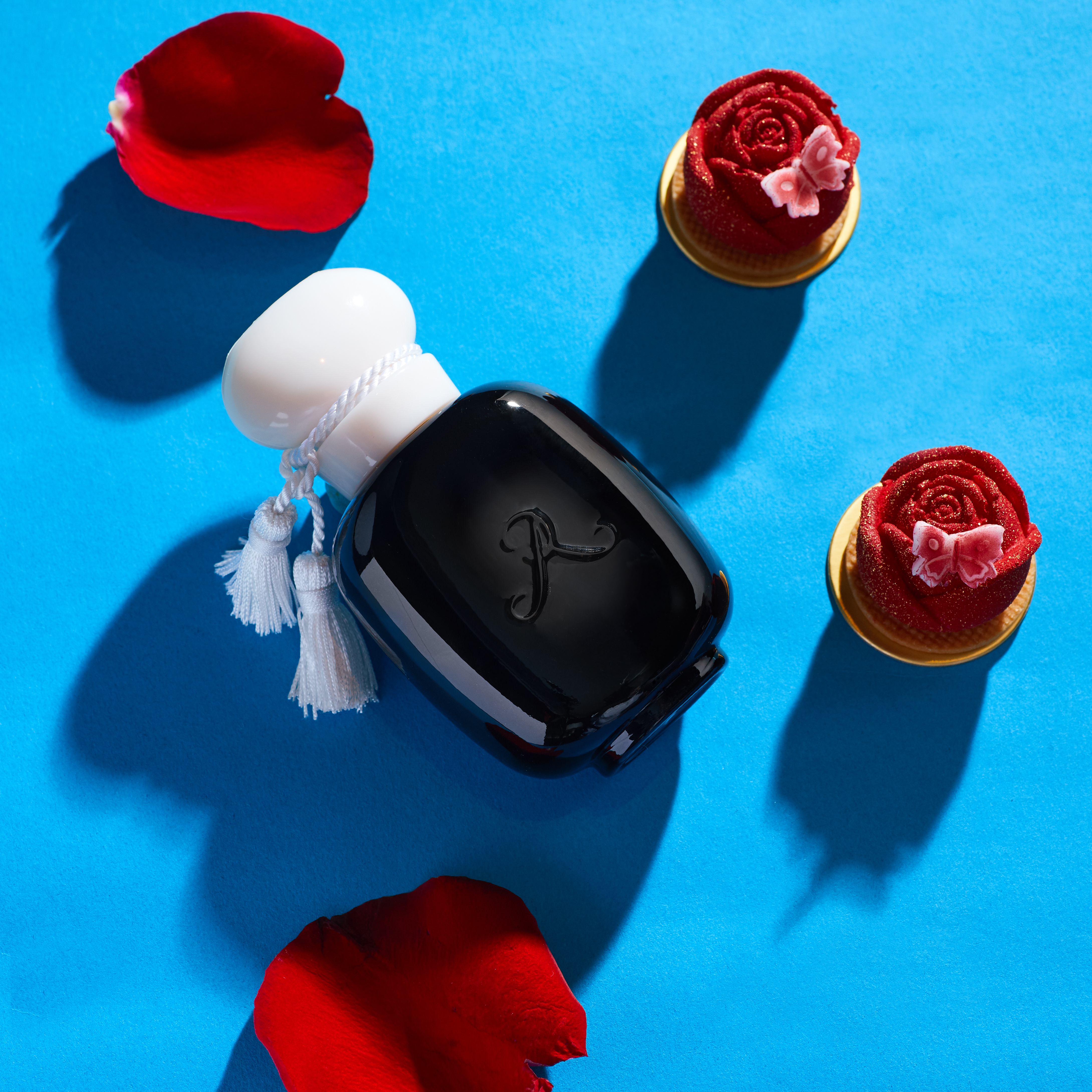士多啤梨慕絲蛋糕造成立體玫瑰花形態,靈感來自法國香水品牌 Les Parfums de Rosine的Rose Absolument。