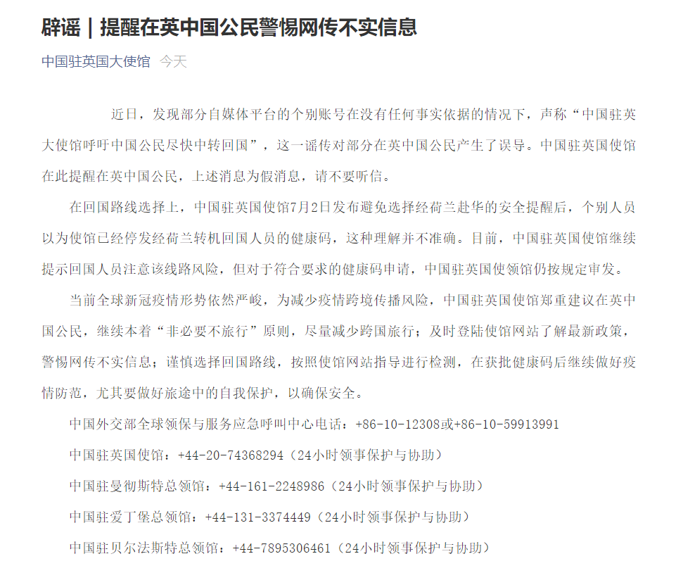 據「中國駐英國大使館」微信公眾號7月11日消息,中國駐英國大使館今日發布消息稱,近日,發現部分自媒體平台的個別賬號在沒有任何事實依據的情況下,聲稱「中國駐英大使館呼籲中國公民盡快中轉回國」,這一謠傳對部分在英中國公民產生了誤導。中國駐英國使館在此提醒在英中國公民,上述消息為假消息,請不要聽信。