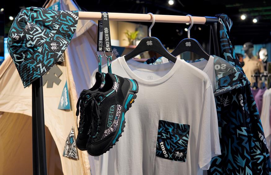 品牌最近聯同日本潮鞋零售商atmos設計出雙面漁夫帽、短Tee、露營椅子Moment Chair及雨衣等一系列限量聯乘的露營用品,甫推出韓國就已經賣斷市,可見受歡迎程度。此系列圖案以自然為原型,呈現雨後樹林的樹枝或落葉景象。創作意念以突然想去感受大自然而啟發,只須帶上該系列幾個單品,就可以到樹林休息放鬆,哪怕是下雨天。仔細觀看,還有不規則樹葉、樹枝、石頭、沙子等自然痕跡,通過形象化圖案和色彩漸變,以迷彩印花形式將濕漉漉的場景形象化,頗具趣味。