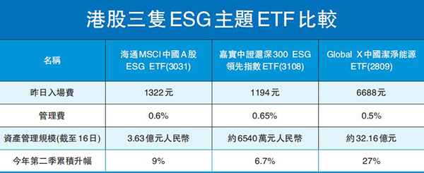 三隻ETF中,海通MSCI中國A股ESG ETF最早在港股掛牌,追蹤「MSCI中國A股ESG通用指數」,每手100個基金單位,以昨日(19日)收市價計,入場費僅1322元。基金管理費每年0.6%;經常性開支比率1.04%。截至上周五(16日),資產管理規模逾3.63億元人民幣;前五大權重股依次為寧德時代(5.06%)、貴州茅台(3.98%)、招商銀行(3.46%)、中國平安(2.49%)、五糧液(1.67%)。