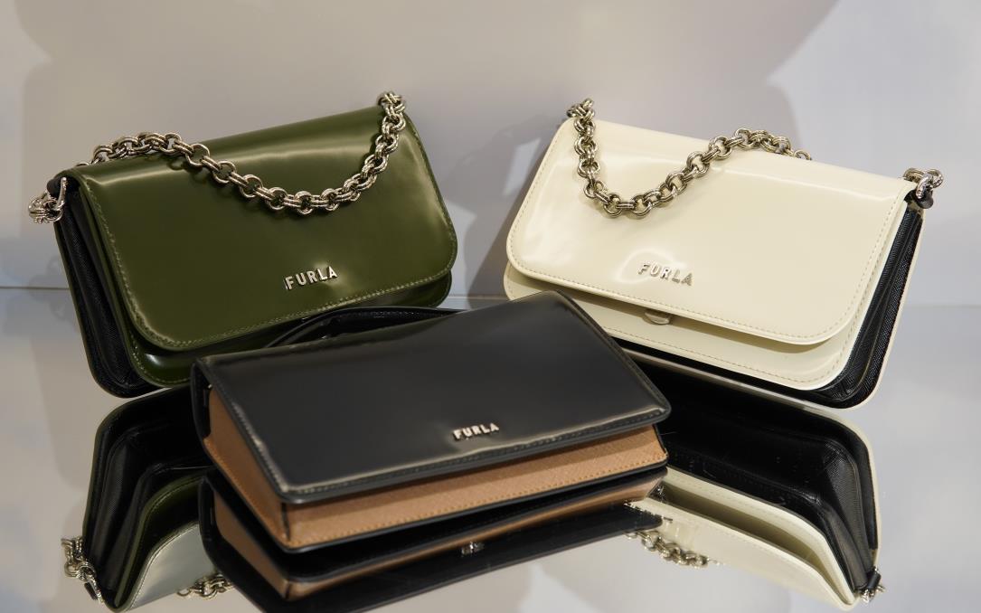 Furla Portagioia是新季的主打,斜揹袋以漆皮與霧色小牛皮組合而成,弧形線條配上金屬釦展現摩登魅力,設計細膩精緻。手袋配有可調節可拆卸肩带,內裏備有卡片夾層的設計,實用與顏值並重。手袋備有兩個尺碼、三種顏色可供選擇,其中酒紅色相當復古。