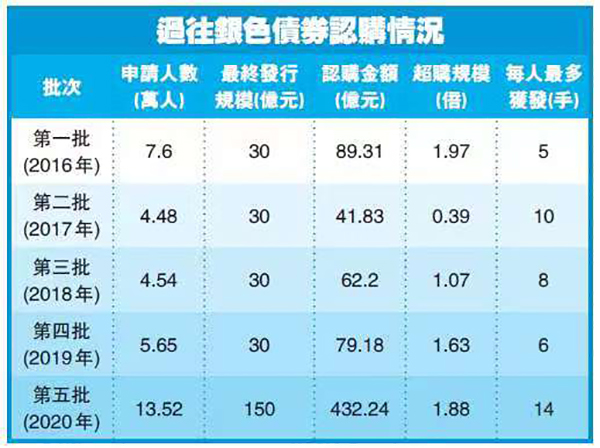 根據政府統計處的臨時數字,截至去年底,本港65歲以上人口約141.8萬人。參考去年底發行的第五批銀債(65歲以上方可認購),認購人數為13.52萬人,佔65歲以上人口比例約9.5%。該批銀債發行額150億元,最終超購1.88倍,每人最多獲發14手。