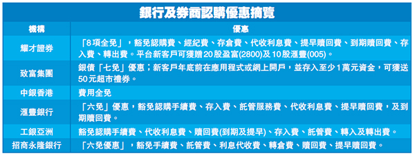 其中,耀才證券(1428)推出「8項全免」優惠,豁免認購費、經紀費、存倉費、代收利息費、提早贖回費、到期贖回費、存入費及轉出費。平台新客戶更可獲贈20股盈富(2800)及10股滙豐(005)。另外,致富證券新客戶在應用程式或網上開戶,可獲送50元超市禮券。輝立證券則為銀債長者提供孖展服務。