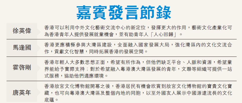 大家下午好。我很高興出席今天由香港文聯舉辦的高峰論壇,與在座的文化藝術界友好,共同探討香港的文化藝術發展,也非常感謝國家文化和旅遊部張旭副部長親臨指導。大會告訴我這次高峰論壇源起國家今年三月通過的《第十四個五年規劃和2035年遠景目標綱要》中,首次將香港的文化地位寫進國家規劃,並提到支持香港發展中外文化藝術交流中心。作為爭取把香港文化事業納入國家規劃的推手,我十分願意與大家分享我的看法,並希望藉此機會,集思廣益,匯聚文化界的力量,在中央的支持下,努力打造香港成為「一國」之內,擁有獨特魅力的中外文化藝術交流中心。