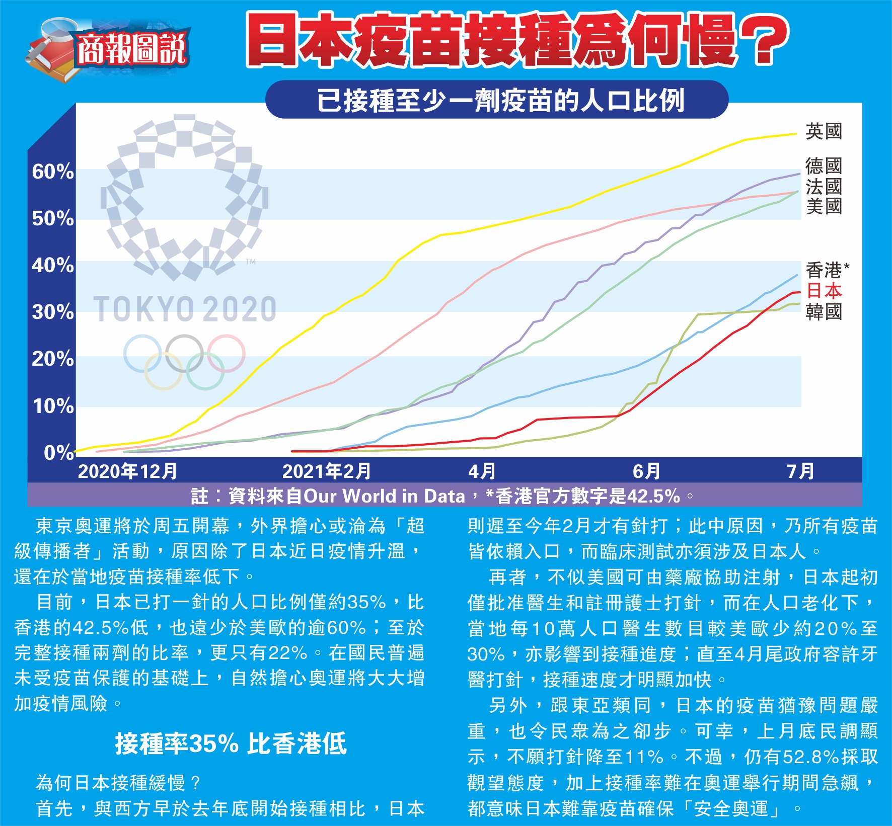 目前,日本已打一針的人口比例僅約35%,比香港的42.5%低,也遠少於美歐的逾60%;至於完整接種兩劑的比率,更只有22%。在國民普遍未受疫苗保護的基礎上,自然擔心奧運將大大增加疫情風險。