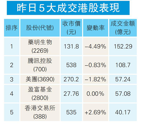 藥明生物(2269)再遭大股東減持,昨日股價反覆下跌4.49%,成交金額多達152.29億元,成交額超越騰訊(700),成為昨日成交榜冠軍,也是表現最差的藍籌。藥明生物表現拖累其他醫藥股普遍偏軟,中生製藥(1177)跌近1%,唯獨復星醫藥(2196)逆市升4.12%。