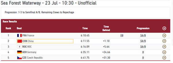張亮/劉治宇分在了第一組,同組共有5條艇,除了中國隊之外,其他4個對手均來自歐洲,可謂最強之組。他們最終以6分11秒55排名第二,落後小組頭名法國的雨果/馬休1.1秒,不過第三名與他們差距明顯。
