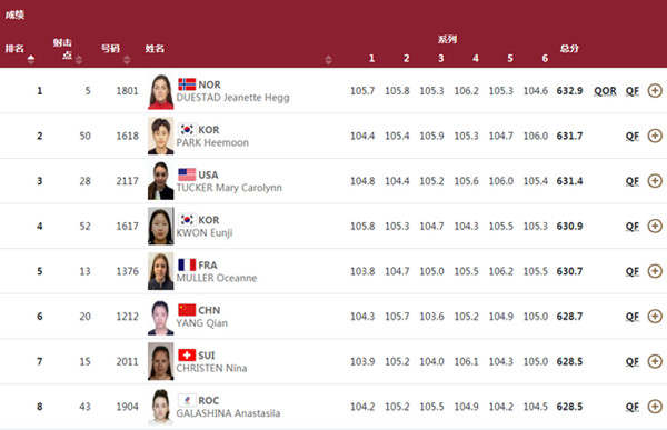 楊倩整體發揮尚可,不過好10環相比較於其他競爭對手略少,排名也長時間在晉級線周圍起伏。不過好在最終是以628.7環的成績排名第6過關晉級決賽。