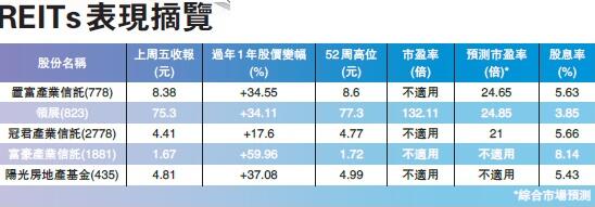 除了上述兩隻REITs表現突出外,領展表現也不俗。截至上周五收市止,領展過去一年股價累升34.11%,股息率稍低,僅3.85%。不過,券商普遍看好領展的投資前景,多間券商早紛紛上調領展的目標價。