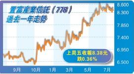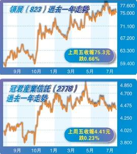 反之,雖然置富產業信託(778)、冠君產業信託(2778)的股息率分別僅5.63%及5.66%,但截至上周五收市止,過去一年置富及冠君的股價卻勁升34.55%及17.6%,跑贏大市,兩隻股頗適合追求穩健回報的投資者。