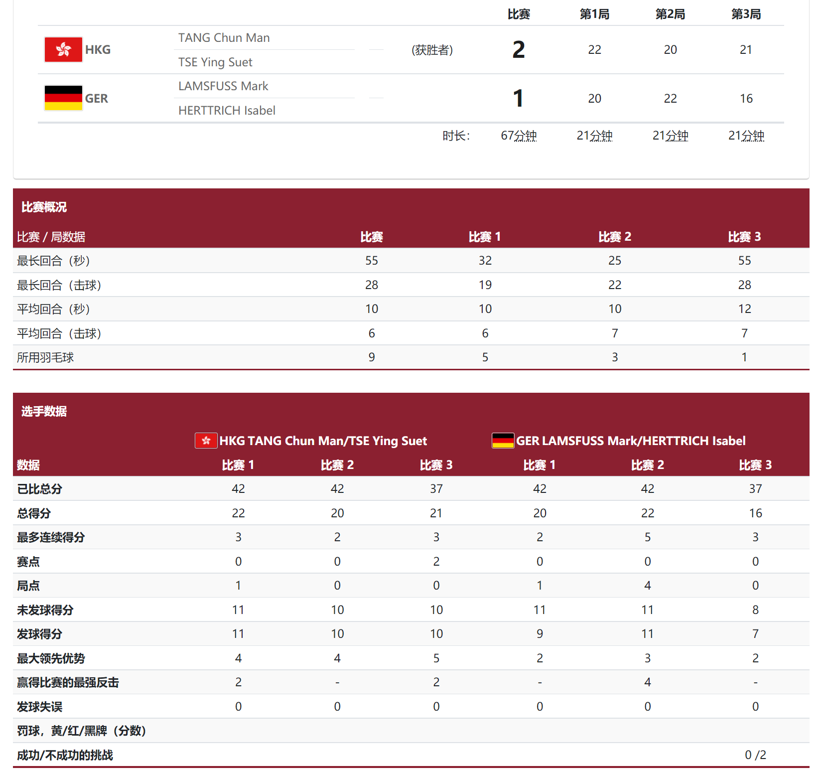 兩隊賽前同是1勝1負,今仗勝方即可出線。第一局,雙方互有領先,戰至末段,德國隊領先20比19,幸好港隊沉着應戰,連奪3分下,先以22比20拿下首局。第二局,港隊一度領先16比12,不過德國隊發力追分,雙方打成20平手,繼首局之後再次進入「DEUCE」,德國隊連取2分,以22比20取回一局。第三局,港隊演出穩定有進,長期保持領先優勢,結果以21比16勝出,總比局贏2比1,成功出線8強。